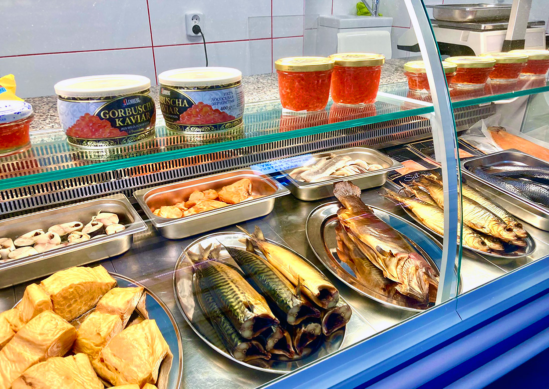 В частности покупатели смогут выгодно приобрести более 30 видов рыбы (копченая, сушеная, маринованная), более 20 видов морепродуктов (мидии, кальмары, осьминоги), более 10 видов креветок, несколько видов икры, морскую капусту, консервы, рыбные снеки, соусы, приправы и вино к морепродуктам.