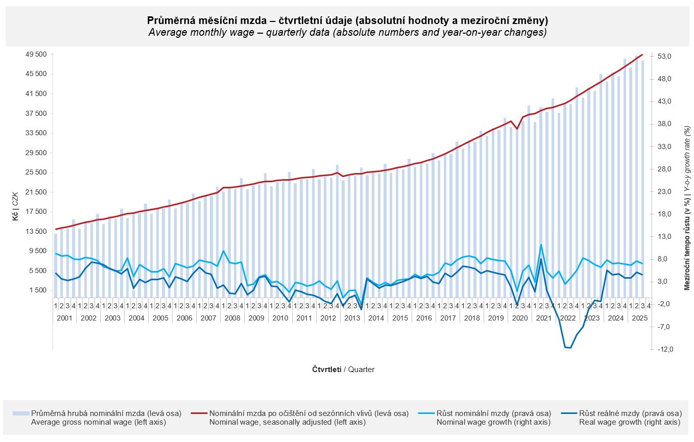В третьем квартале 2025 года средняя ежемесячная зарплата в Чехии («грубая», до вычета налогов) выросла на 3194 кроны по сравнению с аналогичным периодом прошлого года и составила 48 295 крон. Такие данные в четверг, 4 декабря, опубликовало Чешское статистическое управление (ČSÚ).