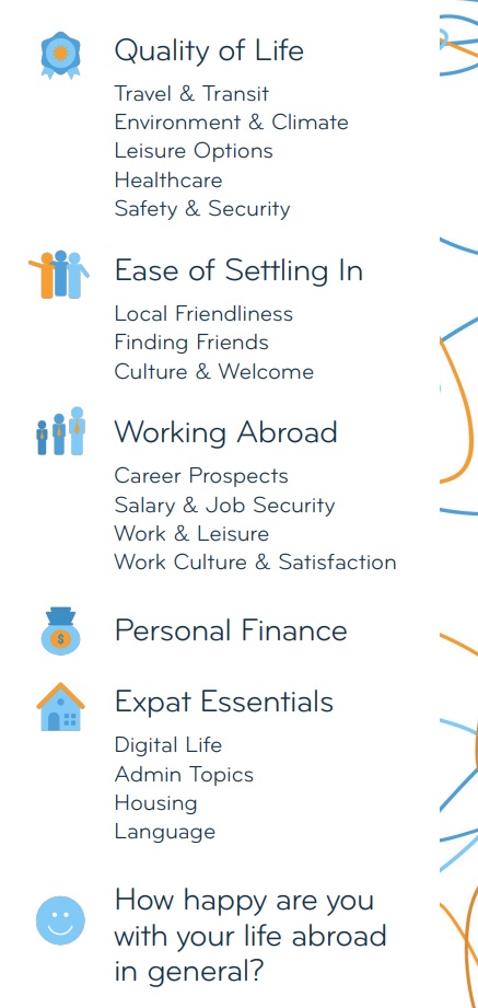 Их попросили оценить 53 различных жизненных аспекта в стране своего пребывания, разделенных на пять основных групп: