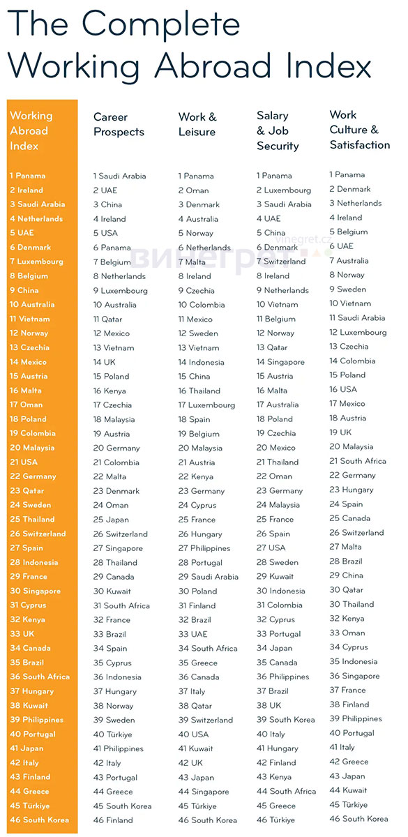 Составной частью исследования является рейтинг стран с лучшими условиями для труда и построения карьеры The Working Abroad Index 2025.