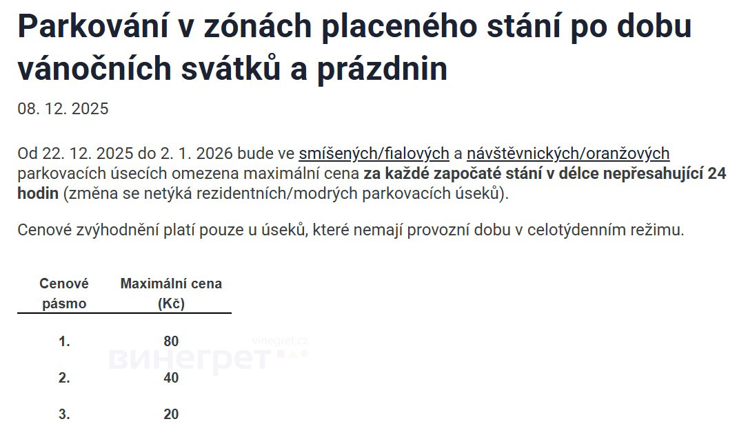 C 22 декабря 2025 по 2 января 2026 года в Праге будут действовать специальные сниженные тарифы на парковку в оранжевых и фиолетовых зонах. Такое решение приняли городские власти.