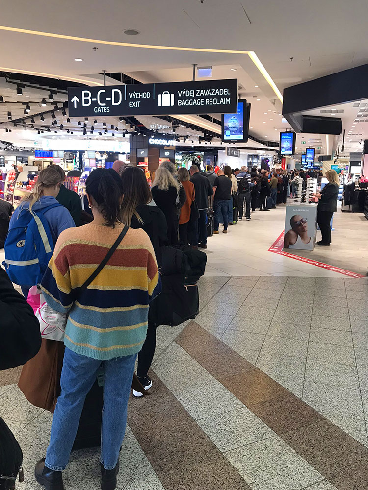 В Терминале-1 аэропорта Праги вновь образовались гигантские очереди на паспортный контроль. Как в зоне вылетов, так и в зоне прилетов. Пассажирам приходится стоять в них больше часа, а нередко и около трех часов.