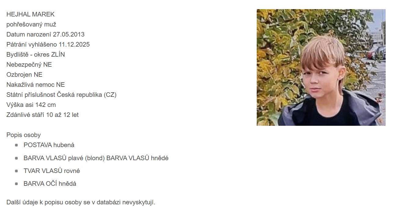 Полиция Злинского края Чехии уже третий день разыскивает 12-летнего Марека Гейгала из поселка Галенковице. Утром в четверг, 11 декабря, он как обычно отправился в школу, но до нее не дошел, и с тех пор его никто не видел.